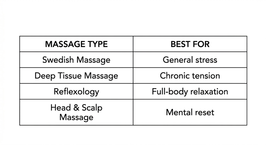 Swedish massage is often ideal for full-body relaxation and mental reset. Its flowing strokes are designed to calm the nervous system and ease general tension.